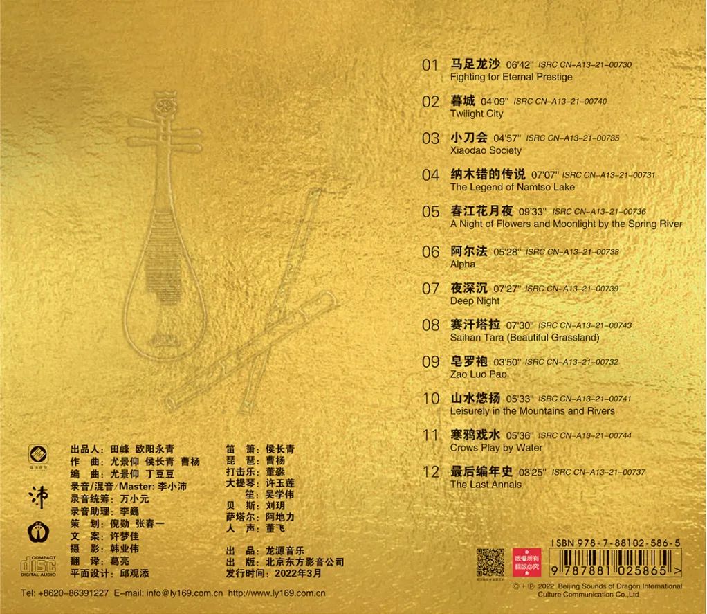 新意十足 巧思无限 精彩音乐世界音乐制作人尤景仰老师为唱片亲自创作了《暮城》《山水悠扬》两首带有现代印象的作品,同时《暮城》《小刀会》《阿尔法》《山水悠扬》《最后编年史》由他编曲。这几首都是现代作品在他的编配下,既有现代感同时又韵味十足。