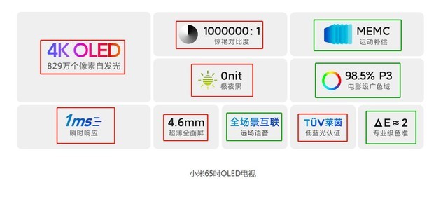 这里我举个例子:上图为小米65吋OLED,笔者将所有OLED面板自带的特质都用红圈圈了出来,而这款电视自带的“软指标”能力则用绿圈标识,我们不难发现,这款电视的多数功能都是OLED面板自带的功能(即:只要是一台4K的OLED电视都有红圈中的特性),而绿色仅有MEMC算是附加功能,△E≈2与色域只是调校素质与成本相关不大,而所谓全场景互联,说的其实是Miui系统,2000块钱的小米电视一样会搭载。