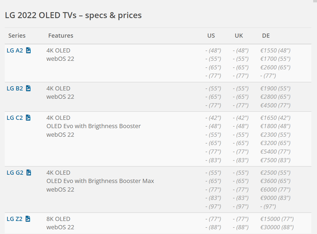 至于8K的Z2系列,只有77和88英寸两个型号,77英寸售价15000欧元,88英寸则售价30000欧元,但是没说采用Evo面板也没说支持OLED EX技术,当然这个价格太高,全球购买8K电视的人都不多,所以也不用太过于在意。总的来说,大家还是将注意力集中在C系列和G系列上,今年的价格看起来还是涨了一些,不过国内价格比欧洲便宜是肯定的,所以就像我们说的这只是一个参考,并不代表国内的价格就是欧洲价格直接货币兑换过来的数字。