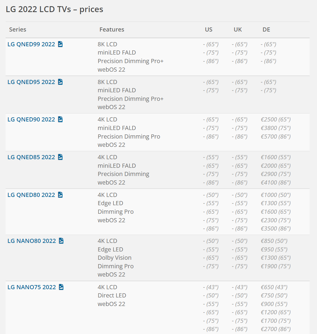 说回LG在LCD电视部分的价格,8K Mini LED电视没有公布。4K的QNED90有65英寸、75英寸以及86英寸三款,其中65英寸欧洲售价2500欧元,86英寸售价5700欧元,这一价格区间实际上和三星的QN90B是比较接近的。当然在产品种类和背光模组上,三星的QN95B显然会更胜一筹,只不过价格也会贵不少。