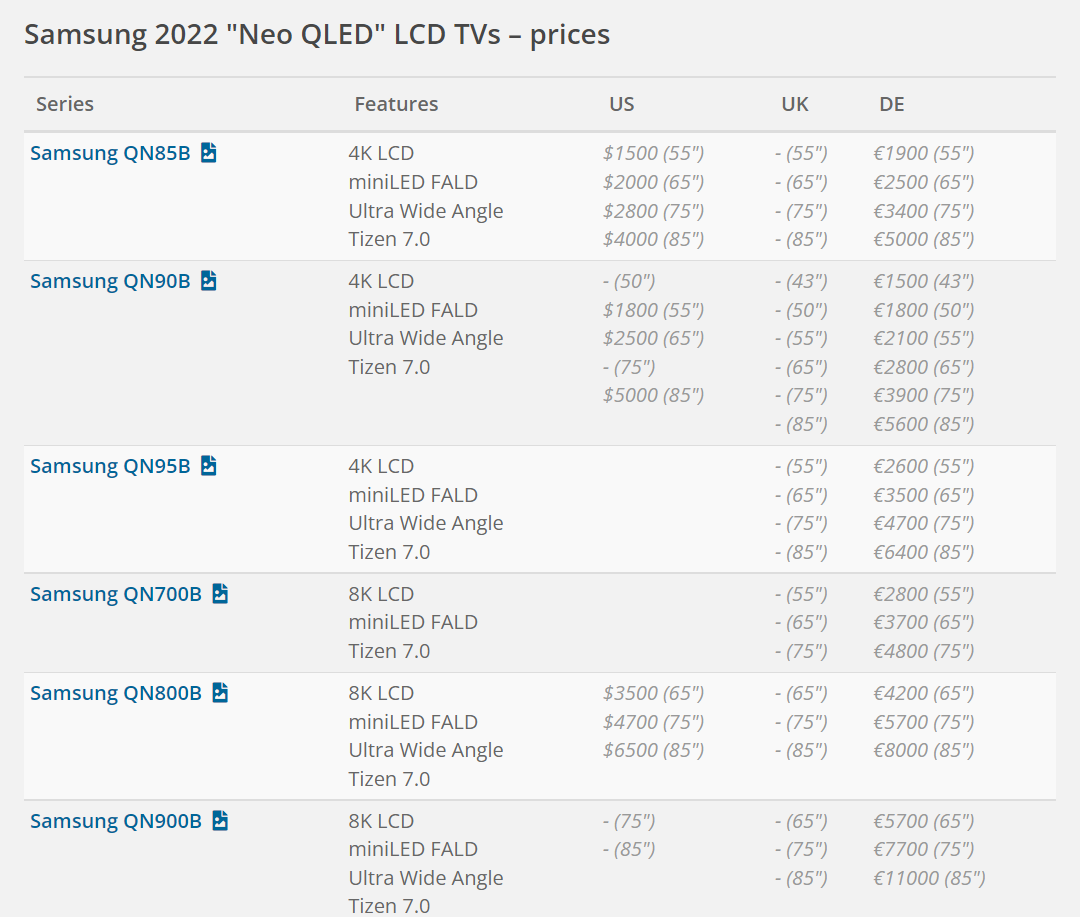 QN90B是三星的主打机型,所以这个机型的尺寸也是最多的,最小有43英寸,最大同样是85英寸,这个机型多出了43英寸和50英寸两个版本。其中43英寸美国价格未知,不知道会不会在美国地区发售,但是欧洲地区价格高达1500欧元,这对43英寸的电视来说无疑是个天价了,而50英寸的版本美国售价1800美元,欧洲也是1800欧元。其他几个版本欧洲价格都要偏贵一些,最贵的85英寸,美国售价达到了5000美元,欧洲则是5600欧元。