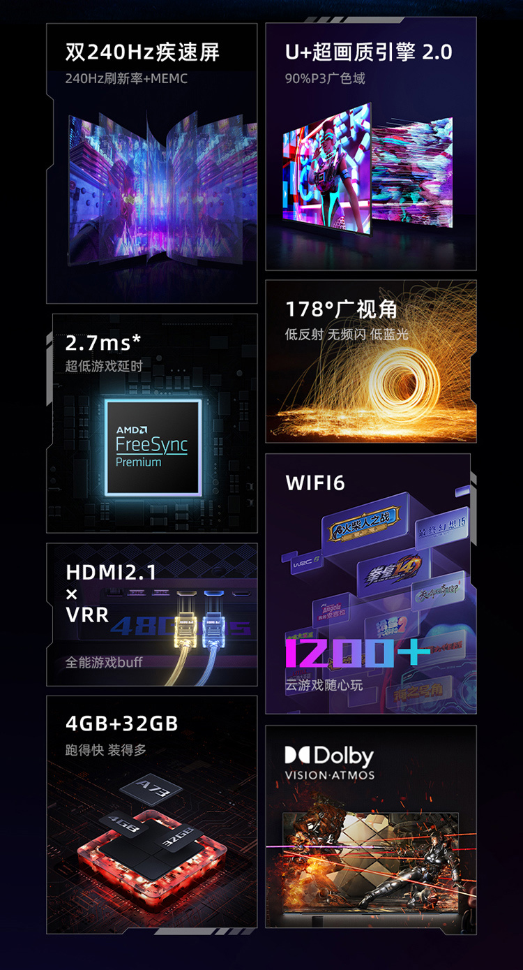 据悉,这款电视还配备了海信 U + 超画质引擎 2.0,通过升级处理器的 NPU、AI 算法以及倍频刷新技术,拥有 AI-SR、AI 色彩均衡、AI+MEMC、AI 精细控光、暗场细节提升、倍频刷新、臻彩四维还原、3D_LUT 原色调校,ΔE≈1.5;而且还通过了莱菌无频闪认证、莱菌低蓝光认证,支持无损 GAMMA、六维降噪、图像智能匹配、护眼模式等。