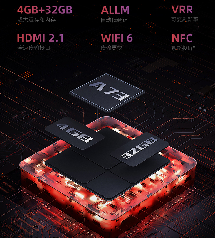 此外,它还配备了全新的 4 核 A73 架构处理器、4GB+32GB 存储和 HDMI2.1、WiFi6,支持 ALLM 自动低延迟和 VRR 可变刷新率,提供天翼云游戏、咪咕快游等多个主流云游戏平台,支持远近双场语音,可通过 FULLINK 联屏互动,感兴趣的IT之家小伙伴可自行关注。