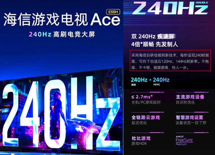 例如海信最近刚出的新品(E55H),号称是双240Hz疾速屏,然而在实际的问询和测试上很容易就发现,这款电视是搭载的120Hz的面板,也是采用了HSR倍频技术才达到的“伪240Hz”。同理,海信 U7G/U7G Pro电视也是类似这种情况,号称是120Hz疾速屏/144Hz疾速屏,然而在实际测试中播放120Hz片源,会自动降帧到60Hz。