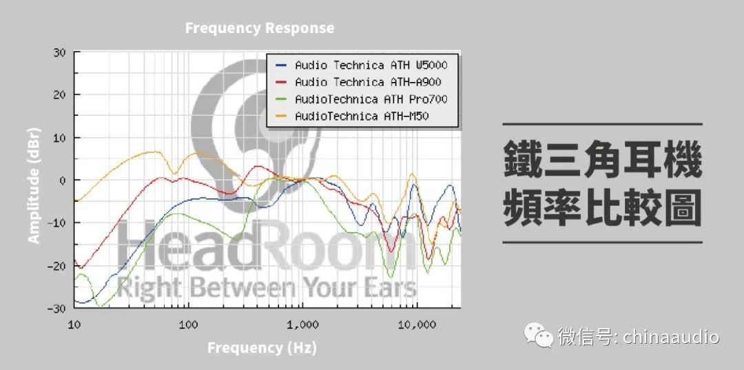 这张图是铁三角四款耳机的频率响应图,每个耳机都有它的个性,可能会增益或减少某个频段的频率。例如图中绿色的线,这个耳机在10-300这个中低频区间减少最多,所以它的低频可能就会比较不炸;有些耳机则是会故意增加低频,让你觉得有种开一人电音趴的感觉。而监听耳机就会尽量贴近0的位置,让混音师可以听到最真实的声音。如图中橘色线就是知名的铁三角ATH-M50x。