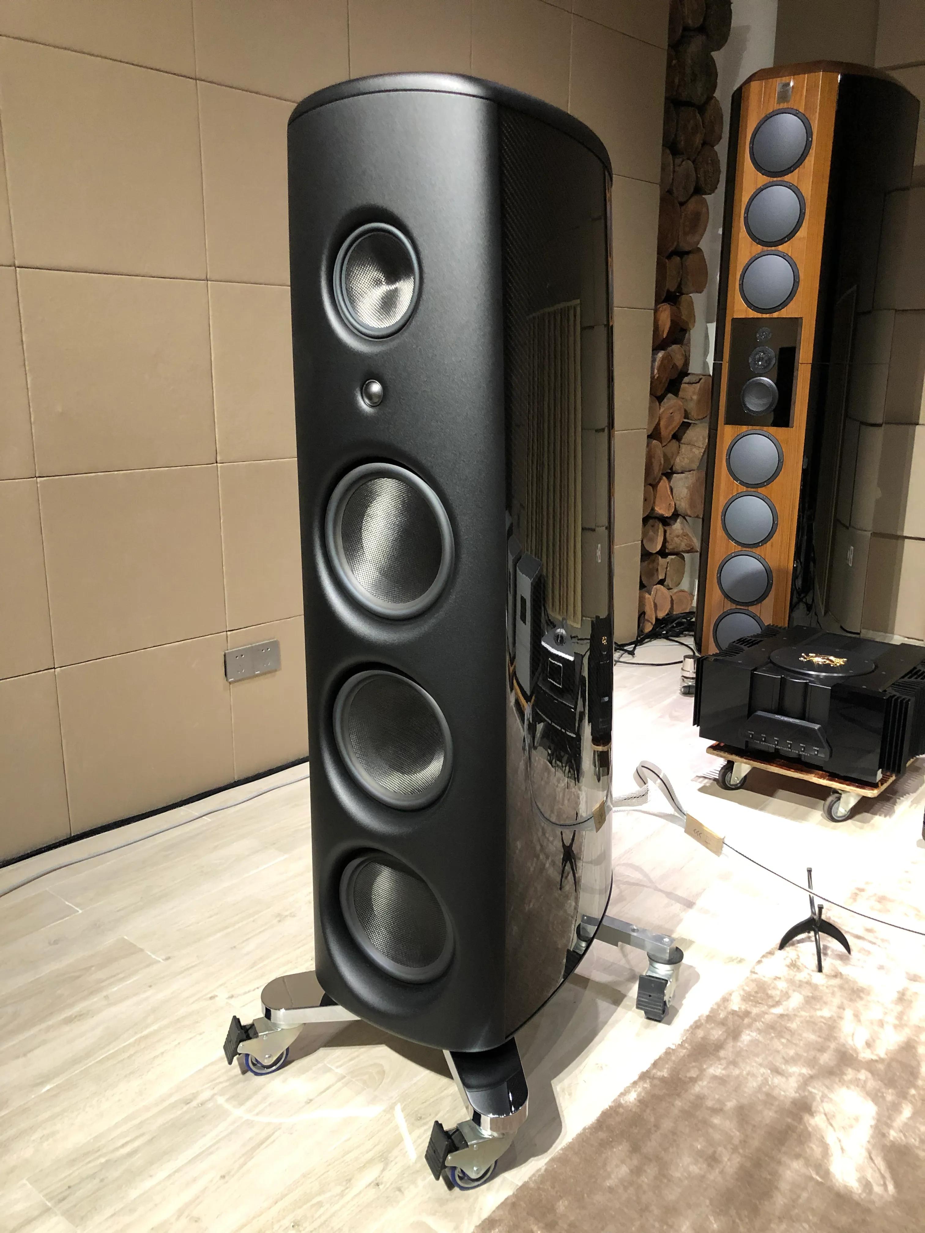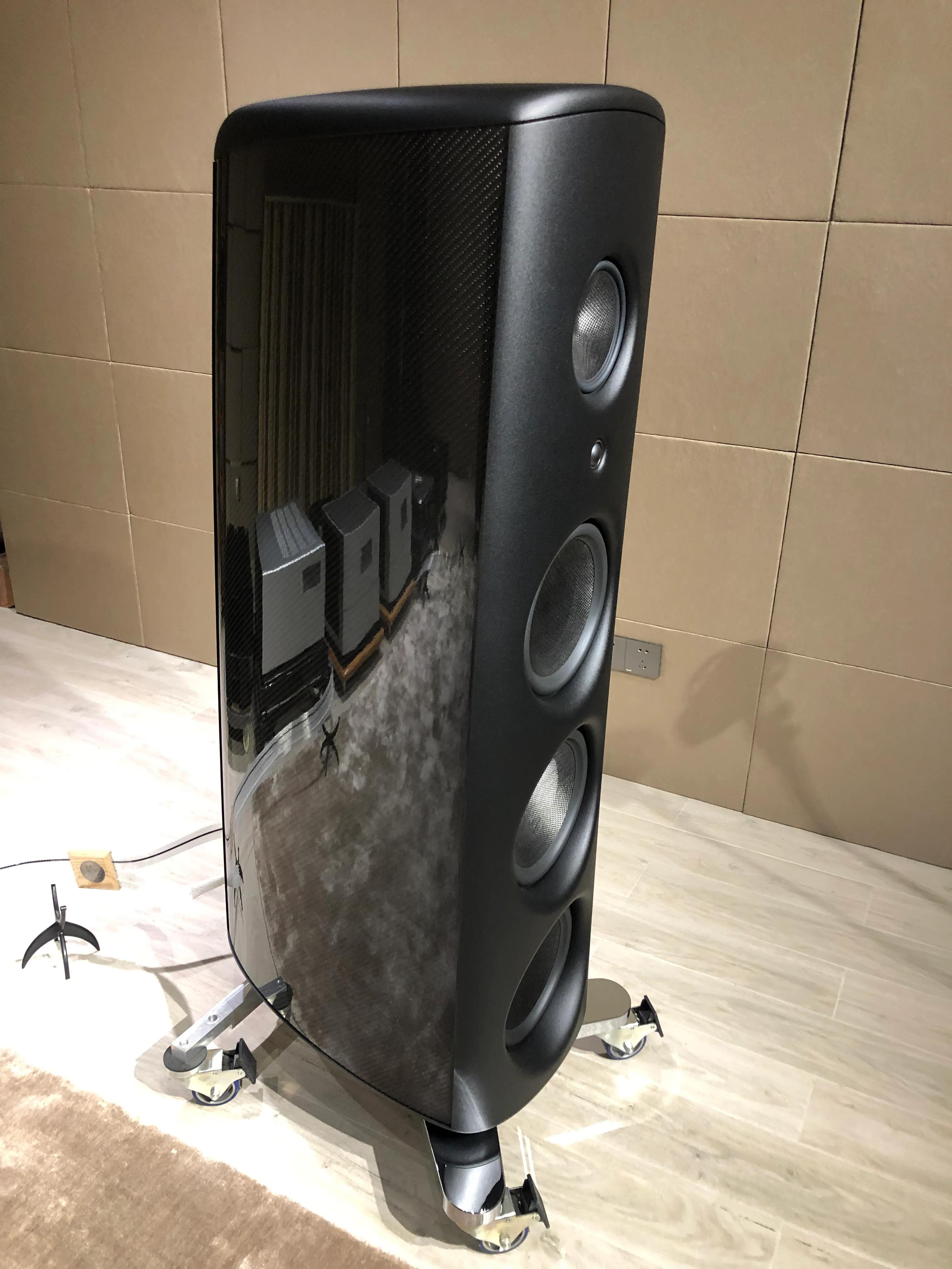 魔域M6次旗舰音箱,开发构思来自美军F35战机,前后上下障板选用航天铝砖,经CNC精密数控机床切割而成!早期魔域产品用过枫木板制作箱体,后来嫌弃钢性不足,后来改为铸造,锻造再到数控车床精密加工铝合金箱体!M6高度1.43米,重量177公斤/只,箱体两侧与里面夹层用上超级跑车碳纤维板材,厚度有半英寸,碳纤维板应用,可以让箱体重量与体积大大减低,重量减少一半,体积减少百分之30!圆浑形密闭式外观设计,有效减少箱体对声音反射影响!箱体内部贴有特制吸音材料,可吸纳抵消内部有害声波衍射,使声音背景更加干净,更好展现录音作品微弱音细节。