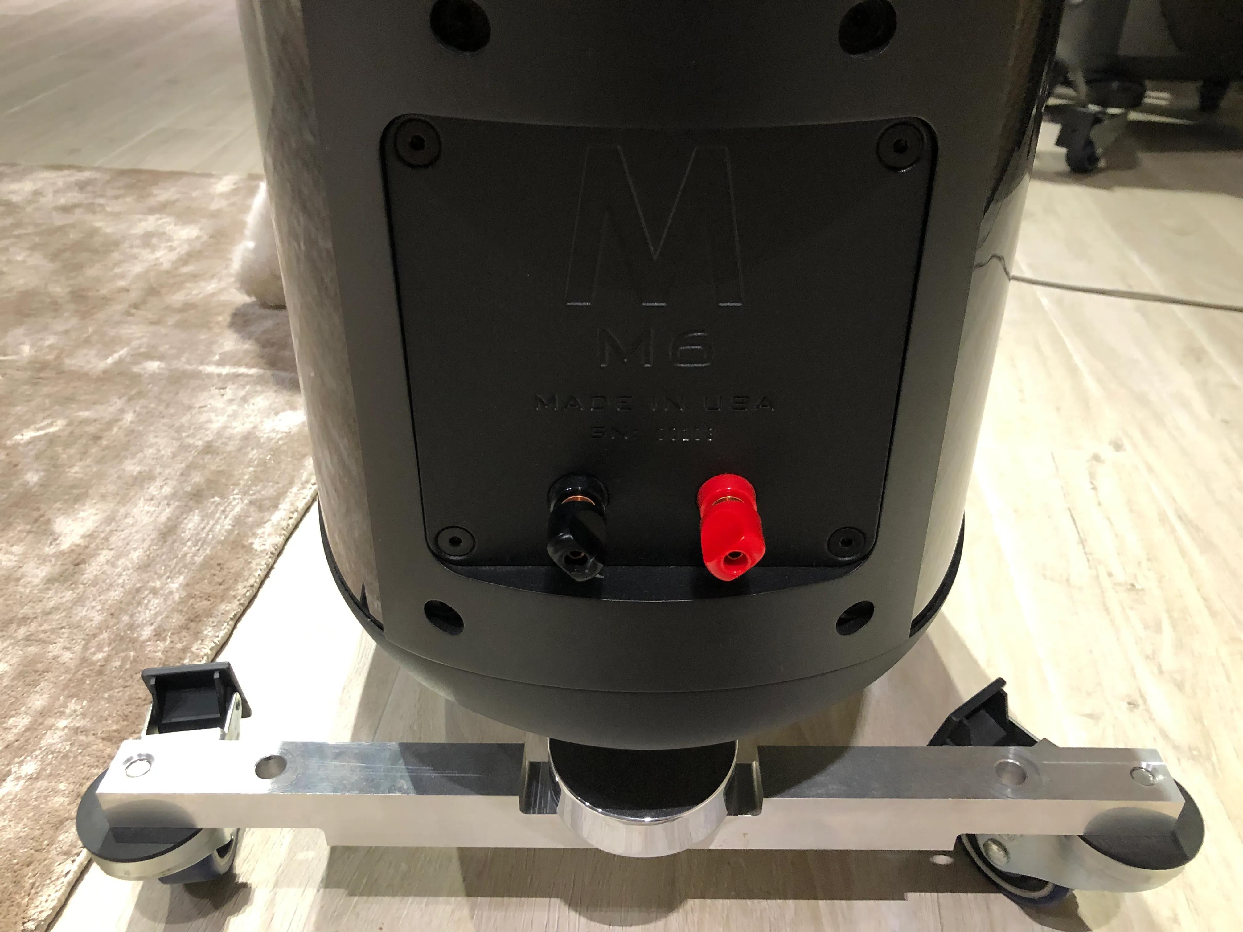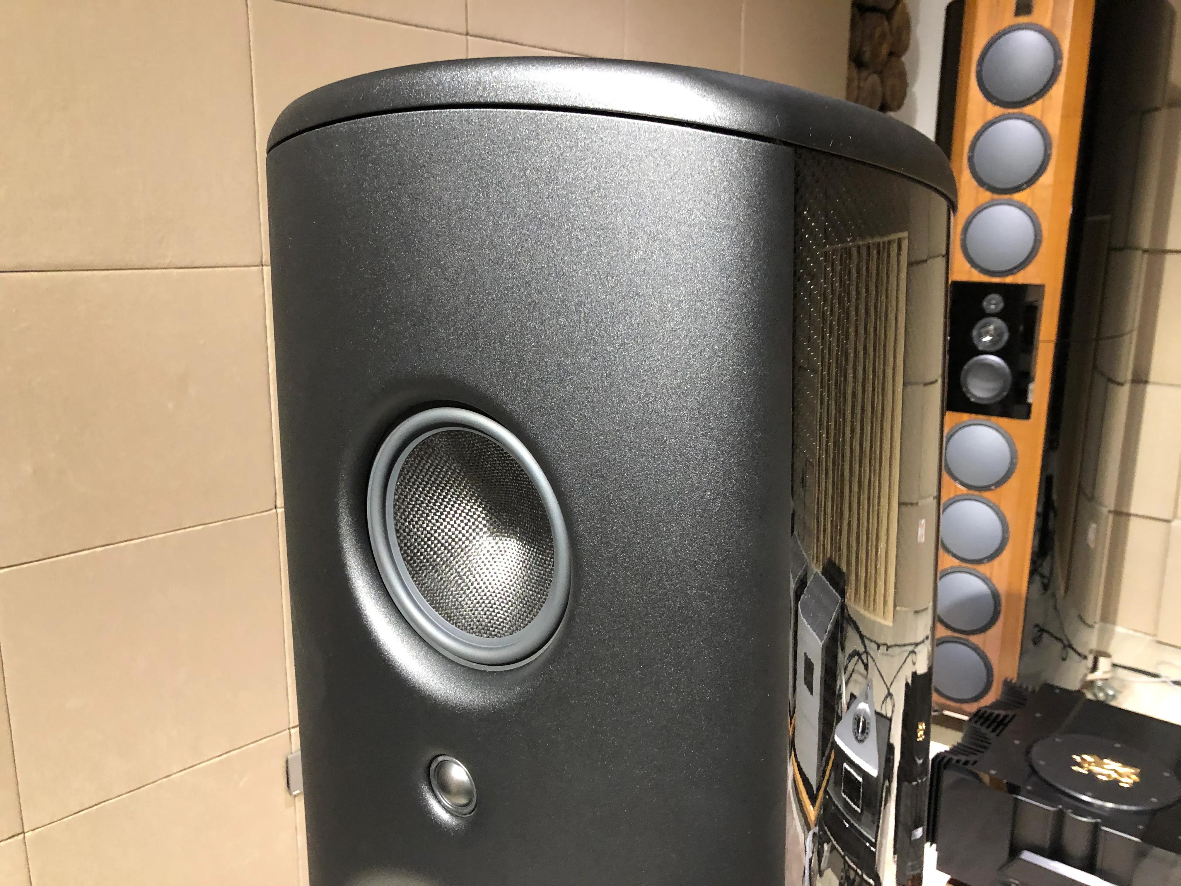 10.5英寸口径低音单元,长冲程设计,振盆用纳米石墨烯与碳纤维进行多层编织,钛金属绕制音圈,加上超大钕磁铁驱动系统,实现了高瞬变与超低失真表现!3只单元垂直一字排开,组装前,厂家对每只单元进行认真测量与技术分析,保证每只单元振膜厚度,弧度达到严格要求后,才会被安装在M6身上,绝不妥协。