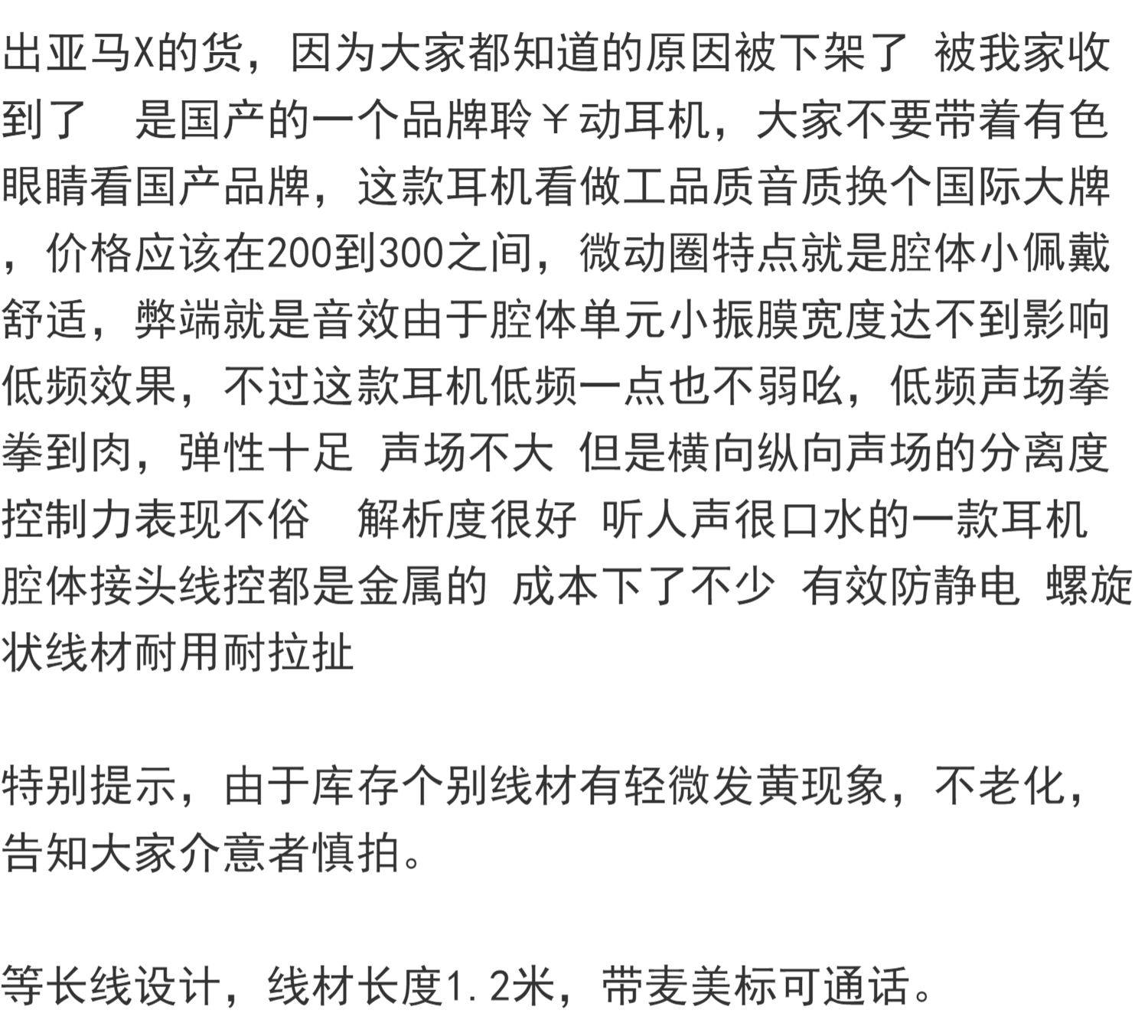 此次到货的这批原装线 比之前的EP360耳机线 线芯不太一样,线芯多一层皮包裹,其他跟之前的EP360线材一样,这款抗拉纤维比较粗,线头上锡处部分有点氧化,库存比较久的缘故,部分有些灰尘,镀金插头很耐用,即使放了十来年也没有多少氧化; 线材对声音的还原很好,试过用在mx500单元上 比其他线材声音有提升,小店秉承物美价廉的一贯风格,低价上新,就这大几百条,库存货,卖完就没有了,需要的朋友抓紧,为经常DIY的朋友更实惠的价格 冲信用不挣钱 请勿提出砍价包邮要求 运费实收 与本店包邮商品一起购买包邮