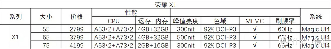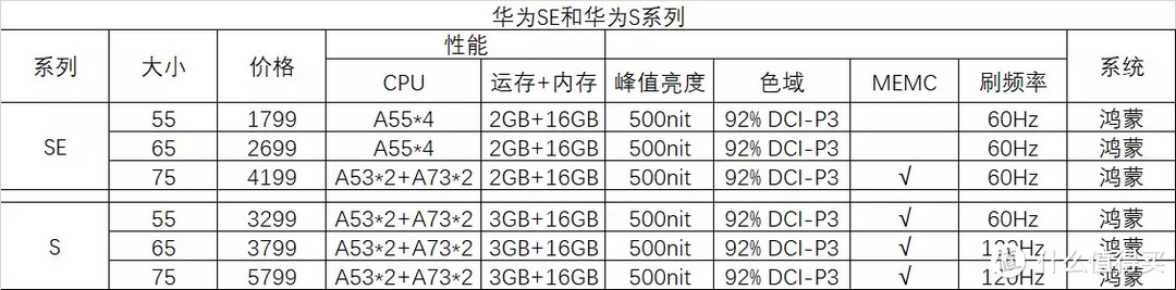 荣耀X1对比华为S系列,在55寸屏荣耀X1性价比更高,65寸差不太多。75寸的X1内存少了一半,应该是没有更新换代,然是老款配置,不过价格便宜。