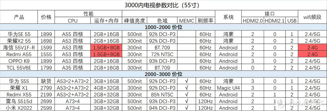 OPPO K9的第一代产品确实诚意满满,各项参数看下来不像是2000内的产品,且无广告,只是系统设计和参数调整在设置上稍显有混乱感。 华为SE各项数据都不错错,该有的都有,性价比极高,属于买了不亏的类型,如果家里华为手机多,可以买华为,特别方便。 红米A55和海信1599,内存太低、且wifi单频段,不是很推荐,特别是红米A55,这款产品太鸡肋了,不如加400买个X55,要好很多。 2000-3000价格,Redmi X2022 和 荣耀X1性价比很高,口碑不错,只是小米有广告,但不是很烦人。Redmi X2022和雷鸟S515D高刷屏,有打算打游戏或是对于画面流畅性要求高的可以考虑。