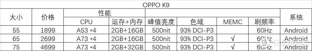 OPPO K9的55寸和65寸的性价比都很高,65寸多了一个动态补偿,这个价格和参数对比无敌,应该算是最优选之一。尺寸数据:
