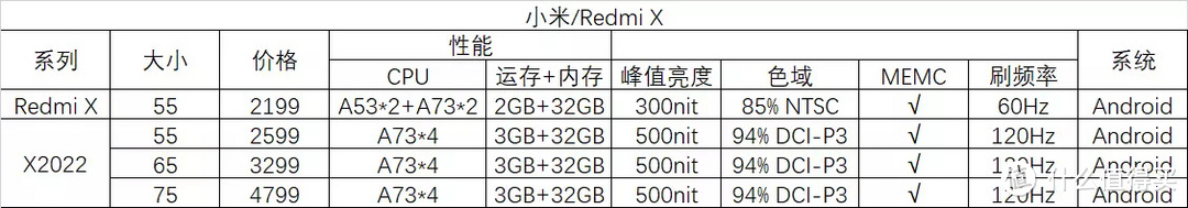X系列其他尺寸性价比不高不推荐,红米X2022其他尺寸参数不变。