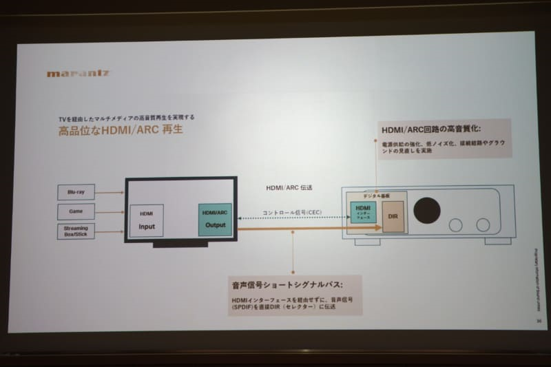 具体来说,提升音质,需要彻底调整包括数字端子板在内的所有HDMI输入部分。音效大师尾形先生说:“音质改善效果还是非常显著的。” 为了抑制信号劣化,只向HDMI接口输入控制信号(EDID),ARC传输的音频信号(SPDIF)通过HDMI接口直接输入DIR(输入选择器)的技术处理就是其中一项煞费苦心的改进。