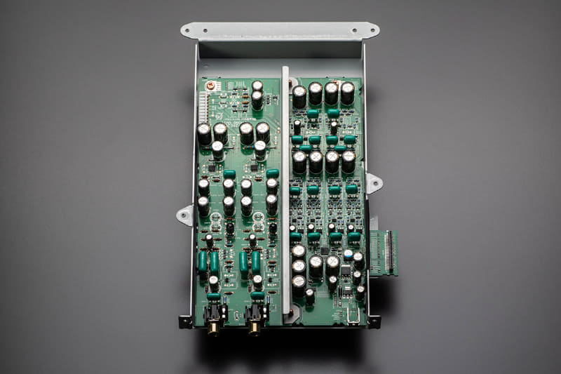 并且,这个小盒子的作用并不仅仅是将数字电路罩起来。屏蔽盒内部有两层,网络音频的HEOS模块+HDMI电路板与DAC+Phono电路板位于不同的层上。第一层和第二层之间还夹了一个屏蔽板,DAC和Phono板之间也设计了一块屏蔽板。简而言之,就像把每一块电路板都放入一个个单独的房间里。