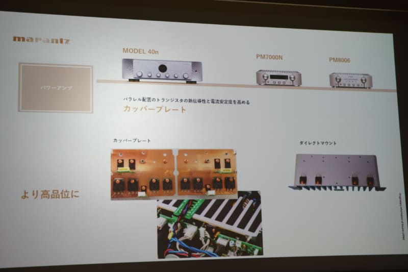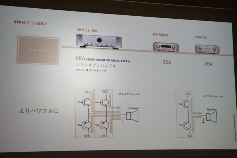 MODEL 40n 的功率放大器部分使用了新开发的模拟放大器,它不是传统的单推挽式,而是采用并联推挽式,将电流增大了一倍,瞬时可提供的大电流达到了68A,大大超过PM7000N的32A和PM8006的45A。