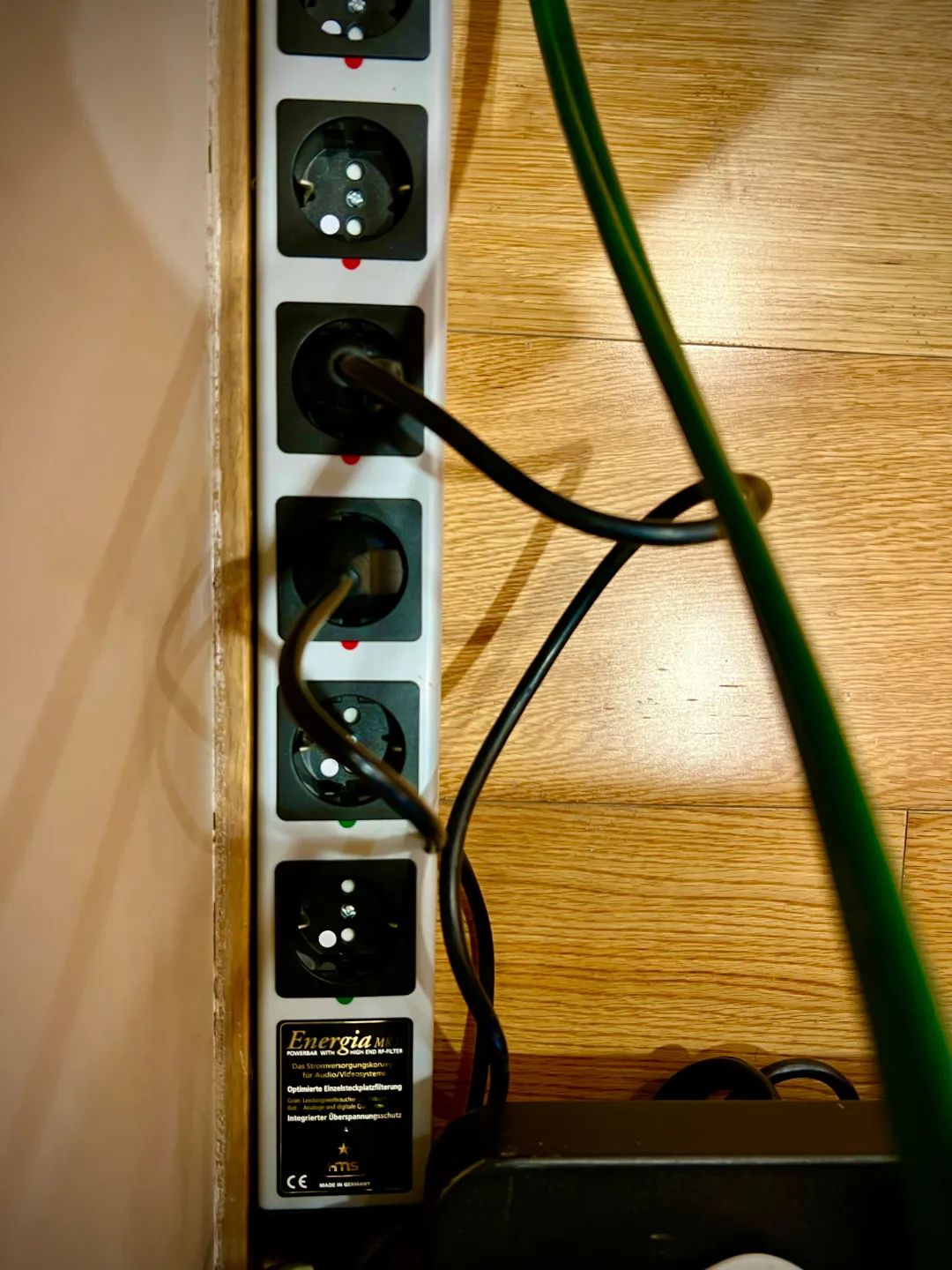 8、问:我看到您用的是跟机的电源线,不觉得配不上这套系统吗? Mr.L:跟机电源线的确是没把器材的效果完全发挥出来。但是因为我个人比较喜欢用欧标的电源线,而国内几乎没有欧标的发烧电源线。欧标电源线能够轻松切换电源线的相位,方便我调整系统的电源相位。上次在力高看到他们有德国HMS的欧标排插,所以果断买了一个,虽然不便宜,但是的确有效果。背景安静了,声场宽阔和深度也有提升。下一步看到合适的电源线,就要订购欧标的发烧电源线了。