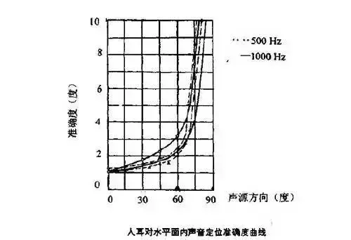 耳朵对于声源方向的判别,在水平方向上是比竖直方向上更好的:在水平方向0角度时,正常人在安静的环境中能够辨析出1-3度的水平方向角度变化,人们对于60度以下角度的判别能力都是很高的,但超过这个角度后辨别的能力就会迅速下降。