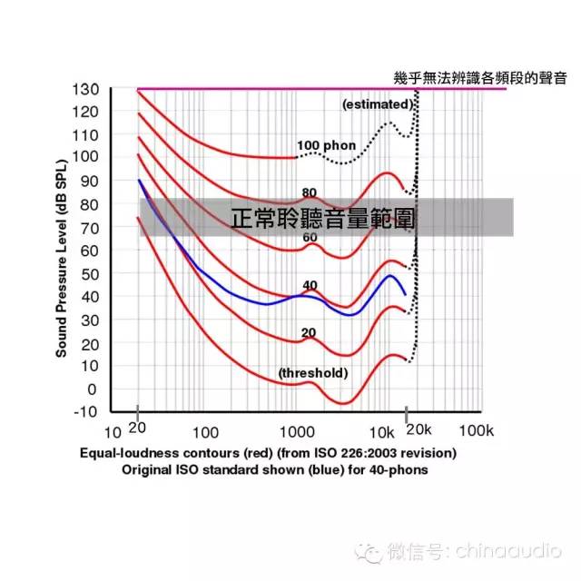 一张图来解释你可能音乐越听越大声  先稍微解释一下上面的线 针对红色线来看,可以发现到人耳对于约莫200Hz ~ 2000Hz之间(也就是中频段)特别的敏感,因为这就是我们一般人讲话、沟通的频率就是坐落在这范围内,这是演化下来的自然结果,所以音量不用大,你就可以听到声音。但是低频就不同了。以60dB的线为例子:200Hz到20Hz之间就相对的需要较大的音量来表现低频与重低音的能量。