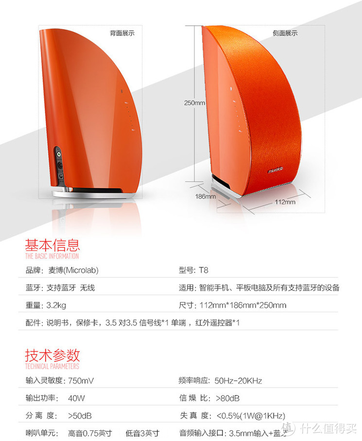 麦博T8 悉尼之声带遥控多媒体音箱。推荐理由:0.75英寸高音单+3英寸中低音喇叭,整机40W输出功率,动力澎湃。 产品净重3.2KG,颇有分量。宽112mm*深186mm*高250mm,不占用过多的宝贵桌面空间。