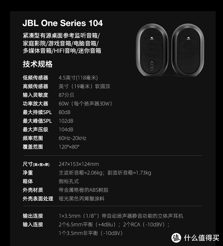 全新JBL One Serries 104参考级桌面监听音箱推荐理由:JBL面向千元市场推出的参考级桌面监听小音箱,4.5低音满足影音娱乐游戏需求。