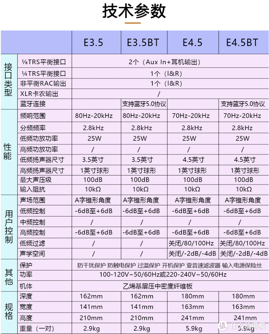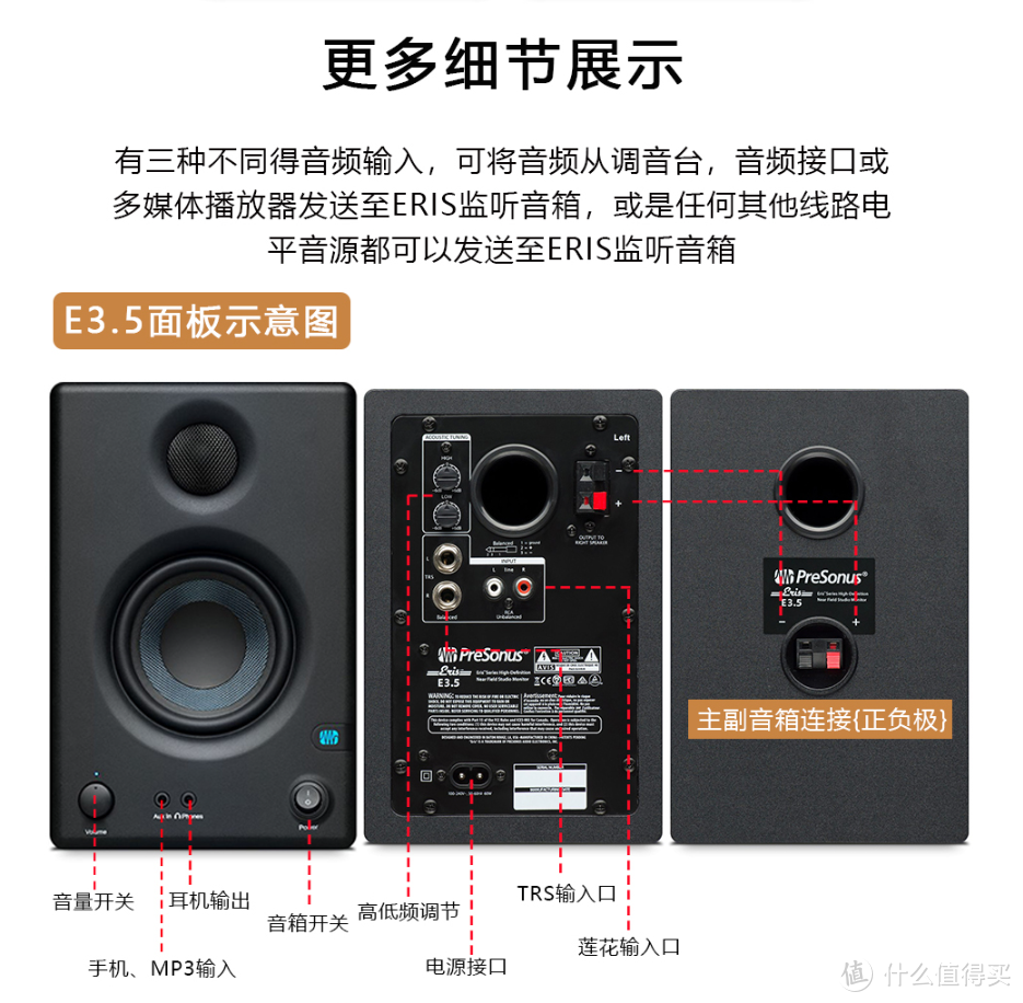 普瑞声纳 Eris E3.5音箱推荐理由:不到600元体验监听音箱。如果有蓝牙需求可以选择蓝牙版本。 其实在PRESOUNS 官网普瑞声纳 Eris E3.5分类“Active Media Reference Monitors”,属于“动态媒体参考音箱”,算不上工作室监听音箱,算是偏监听风格的音箱吧。