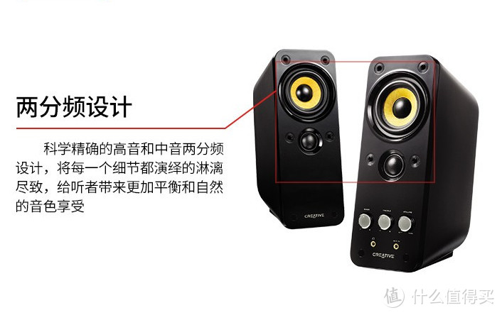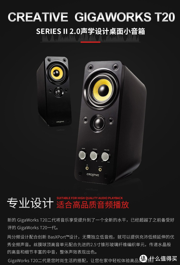 创新T20II音箱2.0书架多媒体电脑音箱。推荐理由:小身材大能量。1寸丝膜球顶高音单元+2.5寸锥形玻璃纤维编中低音单元,高音/低音可分别调整。