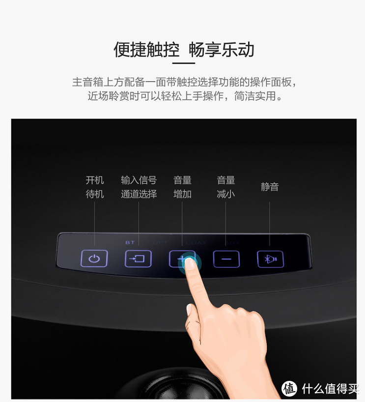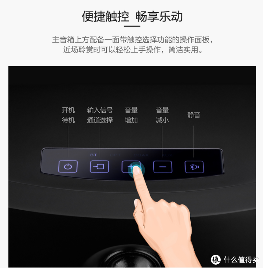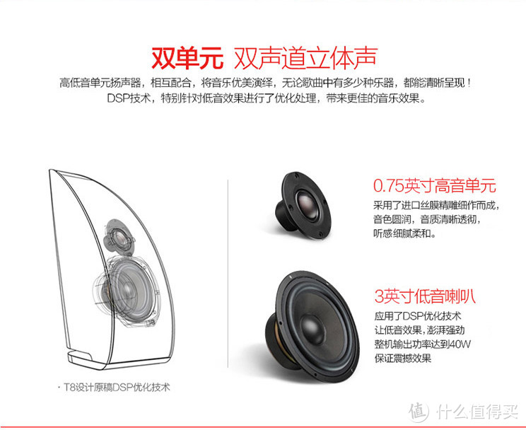 高音采用德国进口的蚕丝丝膜的0.75英寸高音单元,音质清晰,可以获得细腻自然的高音,低音采用3英寸纸盆,整机40W输出功率,动力澎湃。内置DSP信号处理。音箱侧面有可以触摸调节音箱,调节更方便。