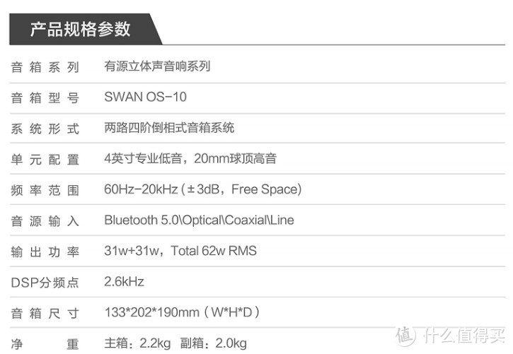 采用2.75英寸全音域单元,40W数字功率放大器,动力澎湃。支持光纤输入,方便外接其他音响设备。 蓝牙5.0传输,悦享无线播放的乐趣。 支持USB解码,可以从U盘直接播放FLAC、WAV无损音乐和MP3音频格式音乐。