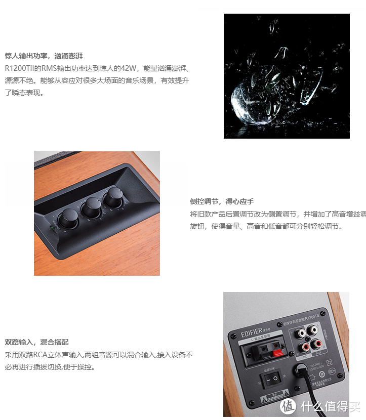 漫步者 R1200TII推荐理由:调节旋钮设计在侧面,方便调节,功率达到42W,价格比较实惠,适合预算比较低的用户。