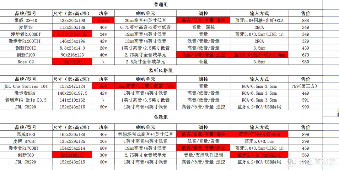 二、预备功课已经做好,言归正传先上个一览表。每个品牌会推荐1-2款基于体积或者性能考虑的型号,每款产品后面有个总结该款音箱适合的桌面尺寸。 商品链接是京东自营官方旗舰店的商品链接接(JVL 104是第三方商店链接)。 监听音箱属于比较专业的领域,本篇不做探讨。