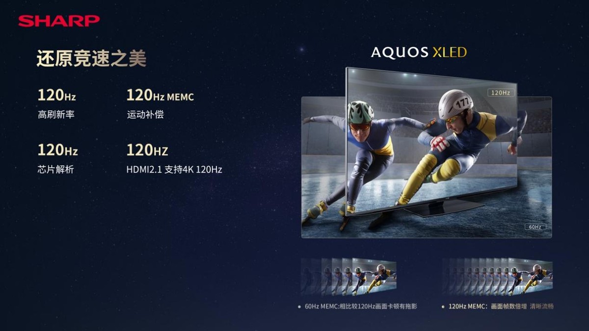 不仅如此,夏普AQUOS XLED标配全通道120Hz,支持120Hz高刷新率、120Hz MEMC运动补偿、120Hz芯片解析,使得画面帧数倍增清晰不卡顿,120Hz HDMI2.1接口的存在即使外接设备输入画面,也能轻松应对。