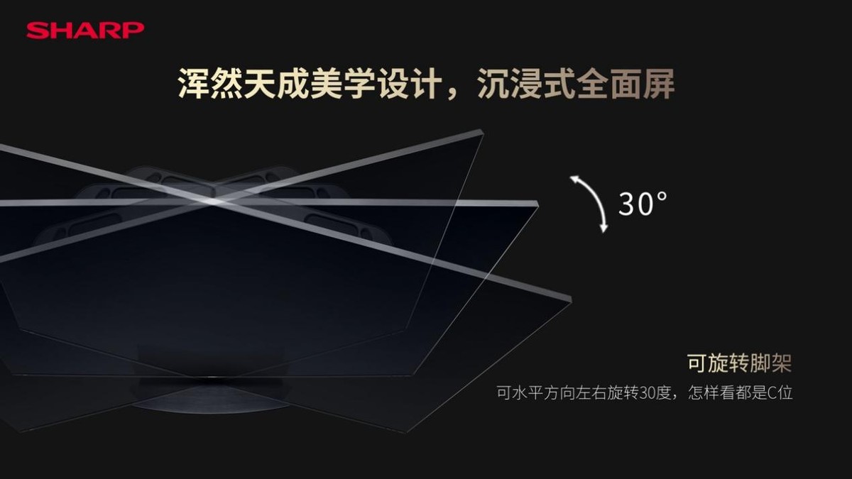 底座采用了方型正中的设计,灵感来源于国人的“中庸之道”,待人接物不偏不倚、折中调和,很是考究,也折射出夏普独特的理解。并且,该设计还可以实现水平方向左右30°的旋转,不仅便于背部接口拔插,也能让观影角度更灵活,处处是C位。