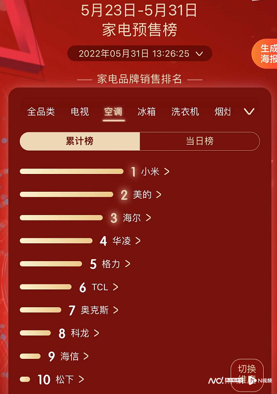 南都湾财社记者梳理发现,截至5月31日午间,京东的空调预售累计榜排名前十的分别是小米、美的、海尔、华凌、格力、TCL、奥克斯、科龙、海信、松下。