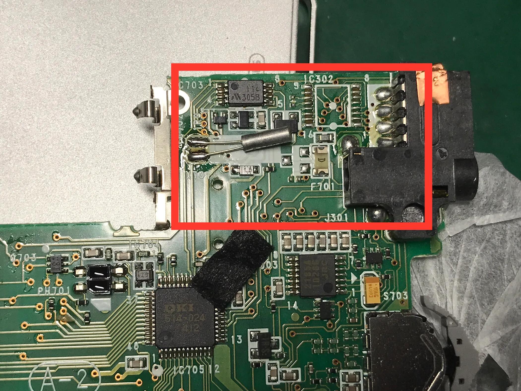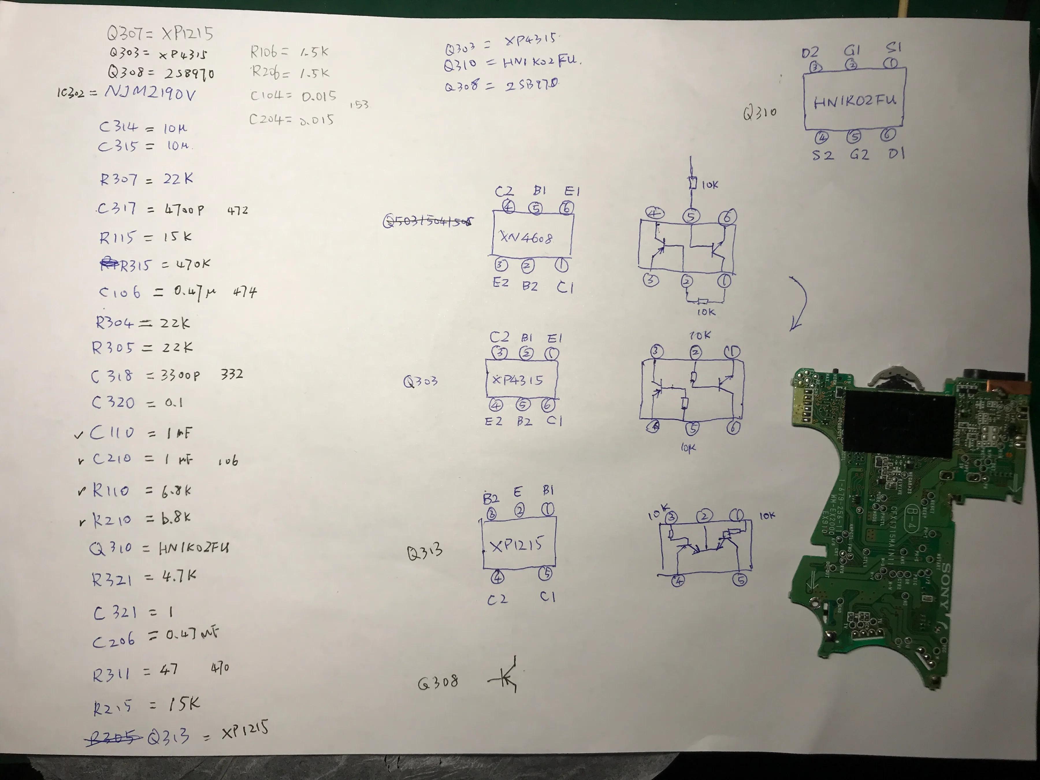 根据原理框图分析,缺失的主要元件有:NJM2190,它是日本JRC专为耳机低压设备开发的SRS 3D环绕声处理器环绕声处理芯片,位于杜比降噪芯片和耳放芯片之间。周边的几只开关管负责环绕声电路的电源通断和音频回路通断:XP4315 基极带阻的PNP NPN复合管; 2SB970 低压差的PNP开关管;HN1K02FU N沟道双MOSFET; XP1215 基极带阻的双NPN管;还有一些贴片电阻和钽电容贴片等等。接下来的工作就是采购收集这些元件,但愿还买得到吧。还有就是主板空间和元件都极其狭小,手工焊接是个挑战。