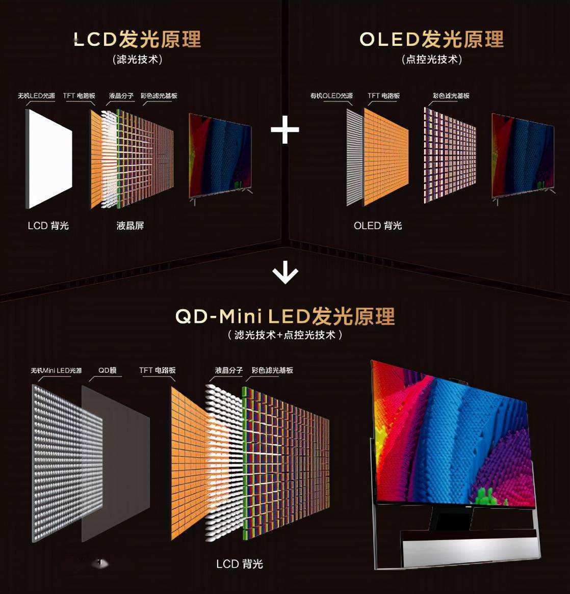 国内的电视品牌TCL还在Mini LED技术基础上引入了QLED量子点技术的特性,官方称之为QD-Mini LED,兼具LCD和OLED的技术优势,突破性地解决了微粒LED芯片巨量转移的行业技术难题,将面光源升级为像素级点光源,同时沿用了全球领先的QLED技术,实现了超高对比度、超高亮度、超高色域、超长寿命,是真正的下一代主流大屏显示技术。