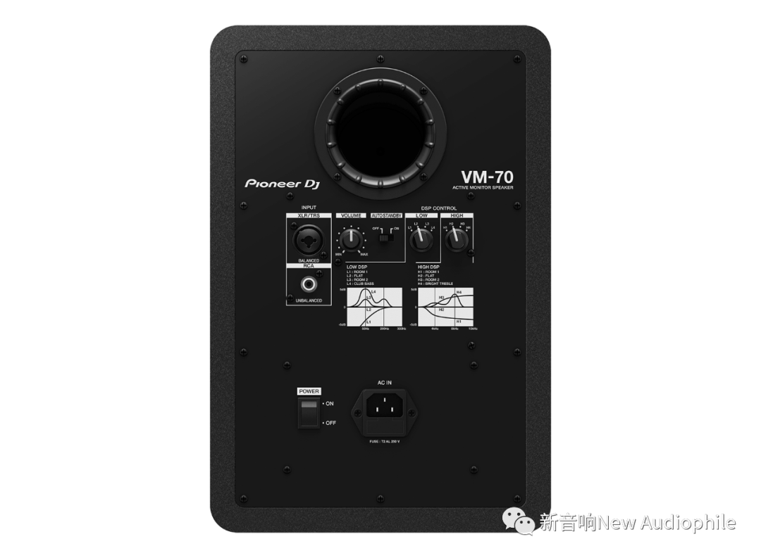 T系列监听音箱还配备了新型D类功放[高音20w,低音50w],内置DSP控制的交叉分频点。在T5V和T7V的后面板上,XLR连接口和RCA插孔分别接受+4dbu平衡输入和- 10dbv非平衡输入。通过一个2档拨档开关来选择信号源。T5V和T7V都可以自动识别50-60Hz,100V240V区间内的交流电。因此,T5V和T7V能够方便地连接到专业录音室或个人工作室系统里,也适用于DAW(数字音乐工作站)上的各种平衡/非平衡音频接口。音箱背部搭载两个三档切换开关,可对高/低频增强或衰减2dB,或是保持平直频响(flat)。这两个EQ开关可以根据不同的环境,例如将音箱放在支架上、桌面上、工作台上或是距墙壁的位置,将音箱的频响微调至最佳状态。