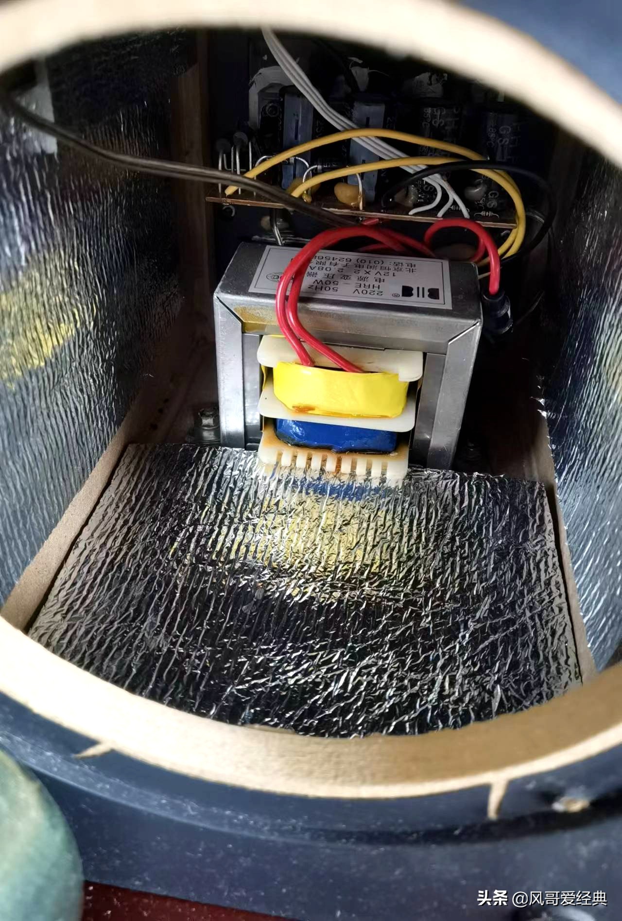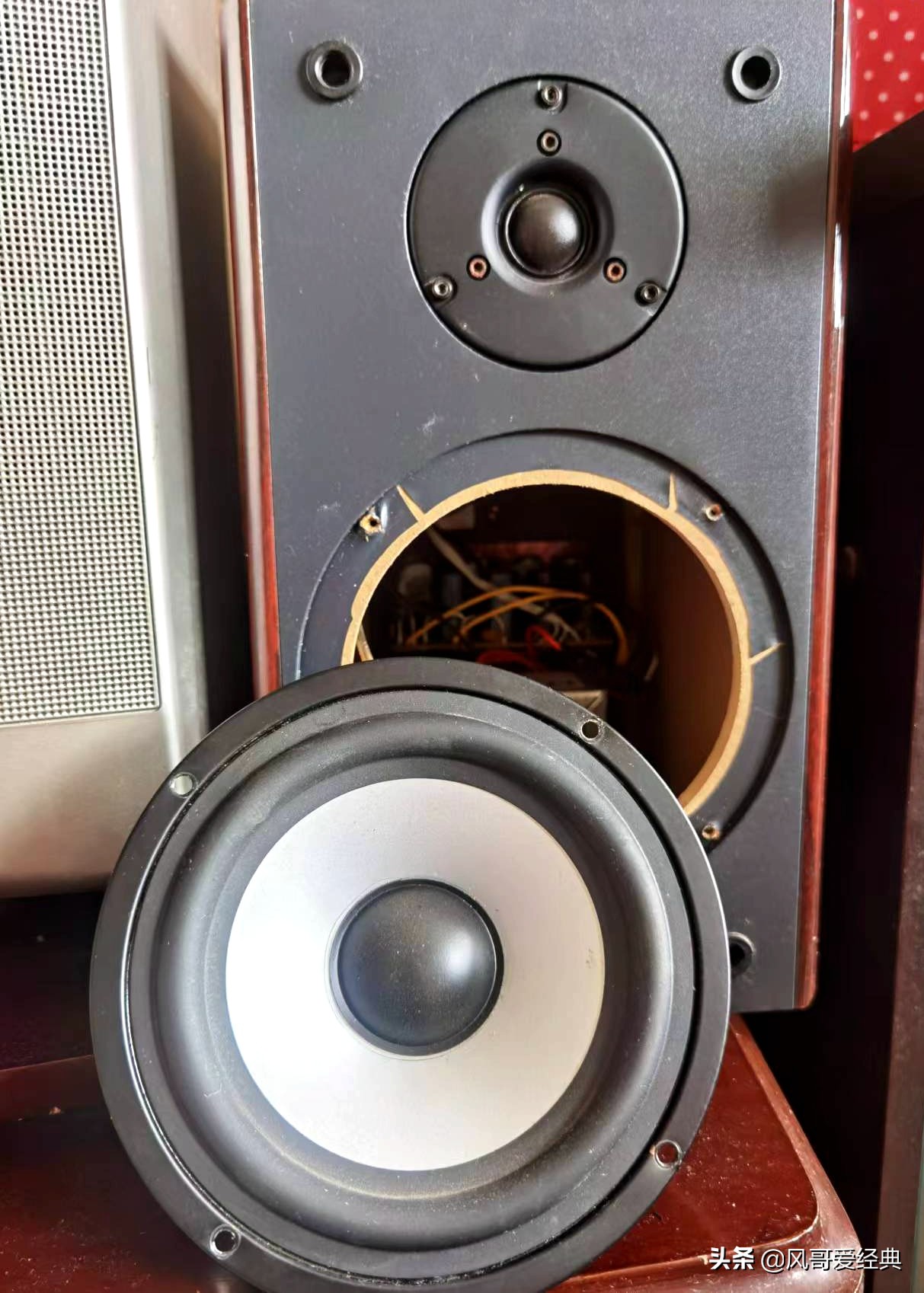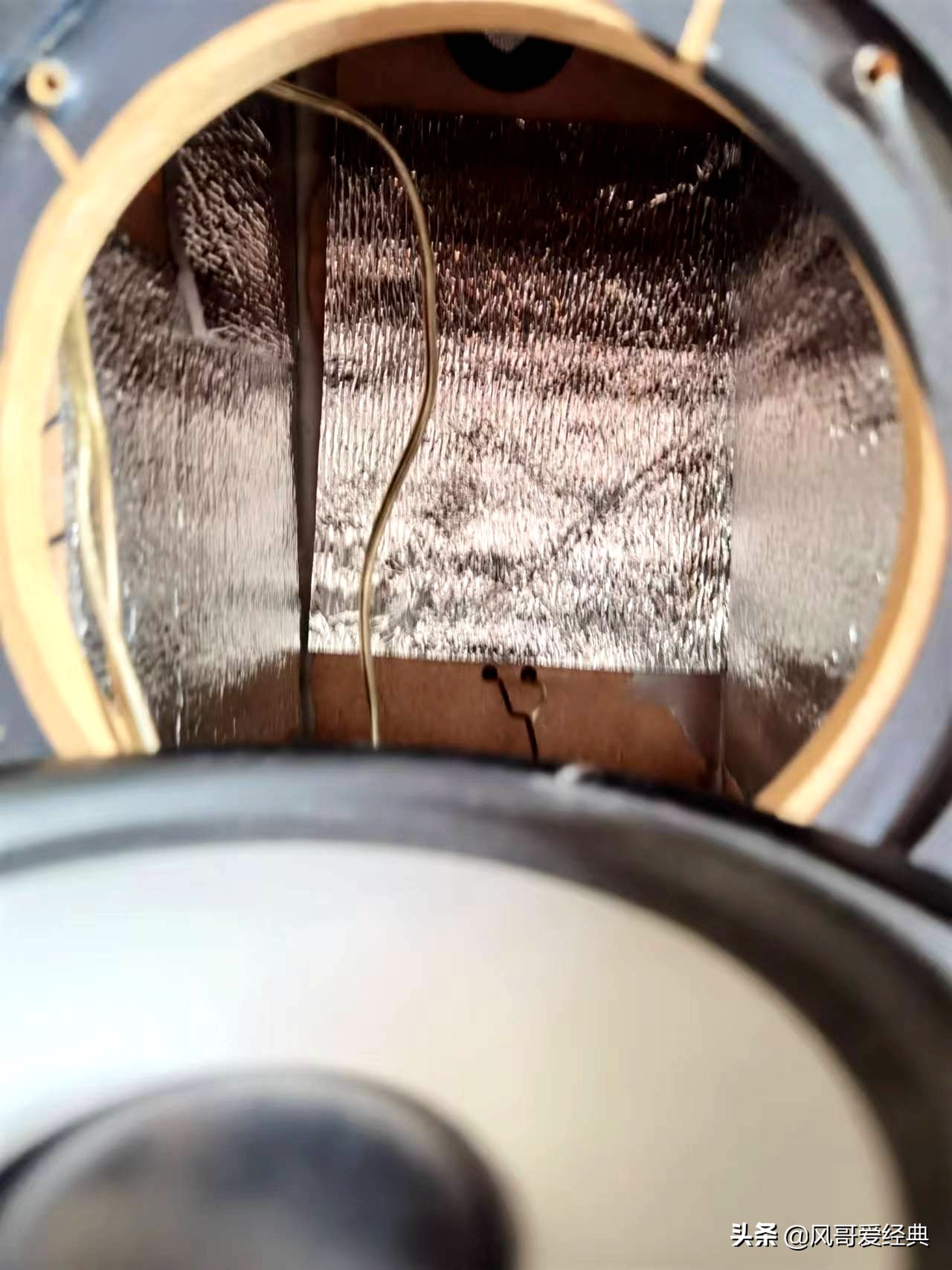 手边正好有一个保温袋,就是快递送生鲜食品的那种包装袋。于是我突发奇想,把它绞成小片贴在音箱内壁上。感觉这种保鲜袋上面有一层薄薄的金属膜,并且后面的泡沫塑料可以消音,这样声音打到金属膜表面,会减小对木质箱体的共振,从而使声音变得清晰一些。还有一点考虑:保鲜袋有保暖作用,据了解声音的传播和温度有关系,温度高一些有利于出好声。 上述第二步改造完全是本人突发奇想之后的大胆试验,相当于“魔教武功”,出手完全不合常理。但试听效果却是不错,声音的解析力明显有所改善。 下面是第三步调整,看上去简单,但至关重要。
