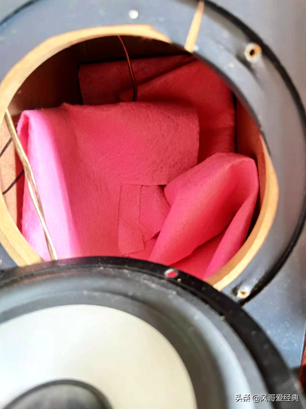 如图,第一次调整时,音箱中加了一些绒布,其成分是聚酯纤维,和吸音棉差不多。此时,箱音被控制住一些,但声音变得死板。于是放弃了这种调整。