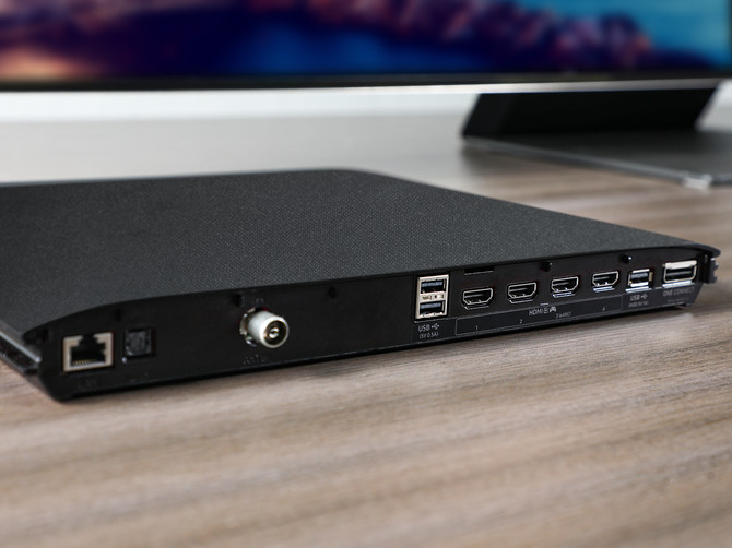 接口方面,这款智能轻薄集线盒从左到右依次提供了网口、光纤接口、ANT天线接口、2个USB接口,4个HDMI 2.1接口(其中一个支持eARC),还有外接硬盘的USB接口,最右边是连接电视的连接线,三星QN700B的接口非常丰富,完全能够满足绝大部分用户的使用需求。