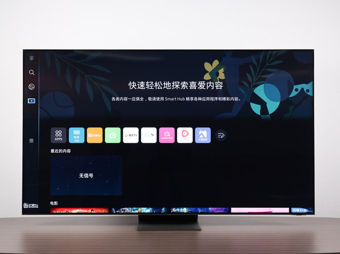 在开机方面,三星QN700B没有任何开机广告,从摁下开机按钮,到进入到主界面,仅需要三到五秒的时间,并且三星内置操作系统的主界面非常简洁明了,上手基本上没有任何难度,更少的二级界面,扁平化的系统设置,让我们使用起来更方面。