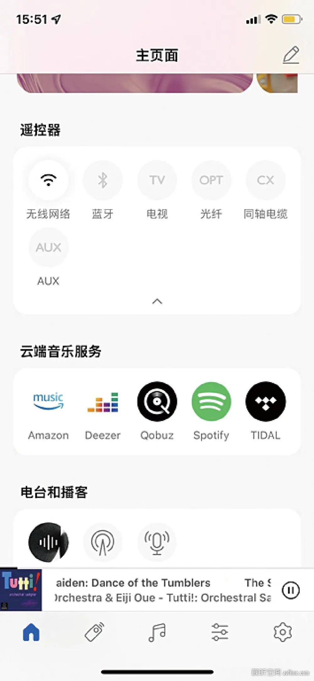 ▲ KEF Connect APP除了能够切换输入通道之外,更内置各种常见的音乐平台和播客,操作起来非常方便