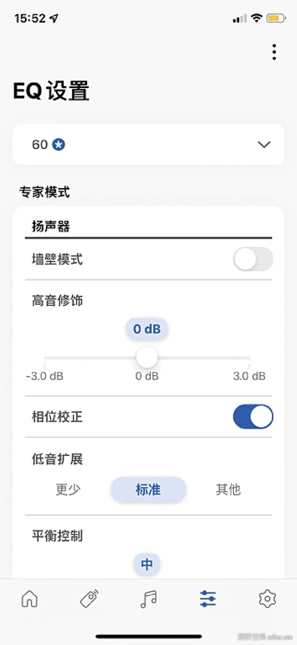 ▲ 此外,还提供了非常详细的EQ设置,对音箱是否靠墙、左右声道平衡、高音±3dB调整、低音扩展、是否使用超低音、低音扬声器的数量、超低音的输出频率点等均可以进行调整