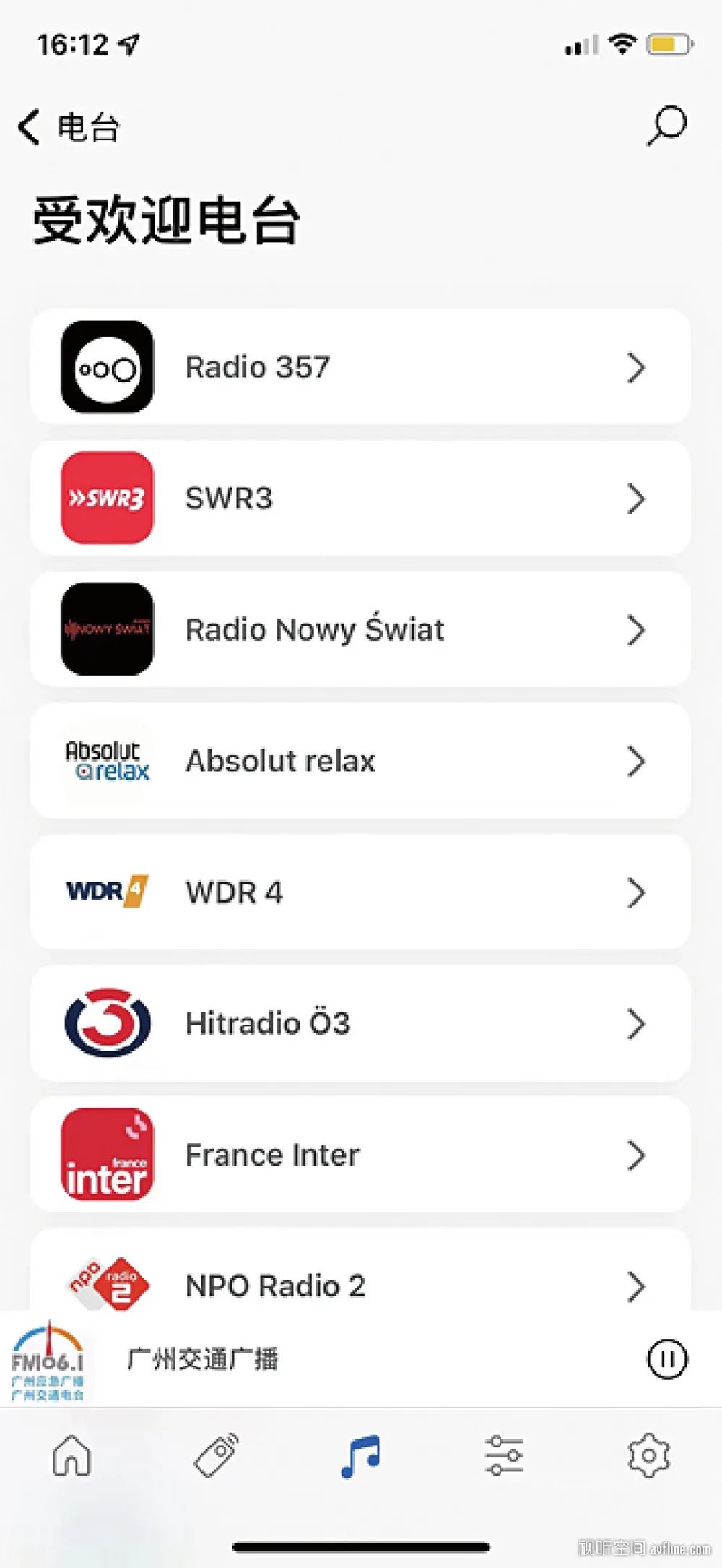 ▲ APP内还有网络电台功能,不同地区的缓存时间有所差异,国外的电台如BBC 2、WDR 4等比较热门的频道,虽然缓存时间较长,但播放起来还是相对顺畅