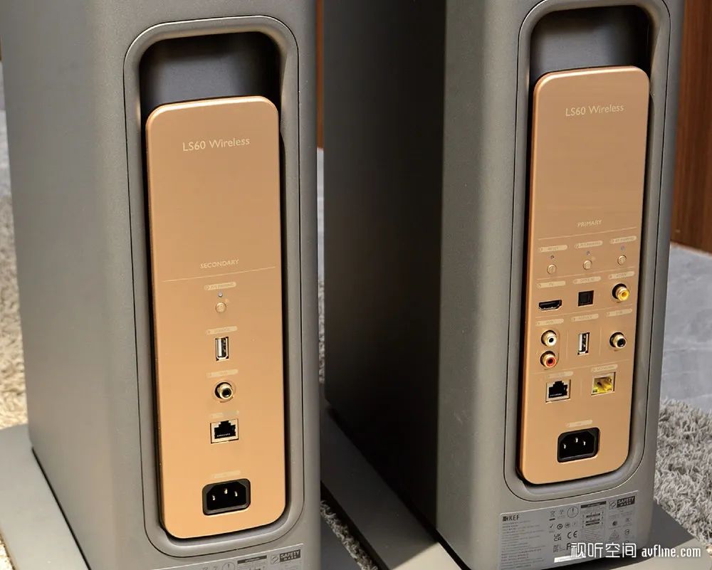 > 丰富的接口 实用的功能 常见的有源音箱一般只提供模拟输入,因此左右两只是一样的设计和接线方式,并且需要通过前级进行音量控制才能使用。而LS60 Wireless虽然也属于有源音箱,但它加入了数播、解码等功能,因此是类似“主从”的形式设置,但其实每只箱都有独立的解码,并配备了DSP电子分频与多路功放,两者之间只是把数据从一路传到另外一路,除此之外都是独立的。