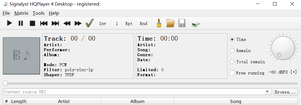 Roon可以根据你的解码器性能自动调整输出品质,并能对一些低比特率的音乐进行升频处理,通过桥接HQPLAY播放器还能实现更强大的升频功能,HQPLAY播放器没有中文菜单,它的界面有点像我们熟悉foobar2000软件。