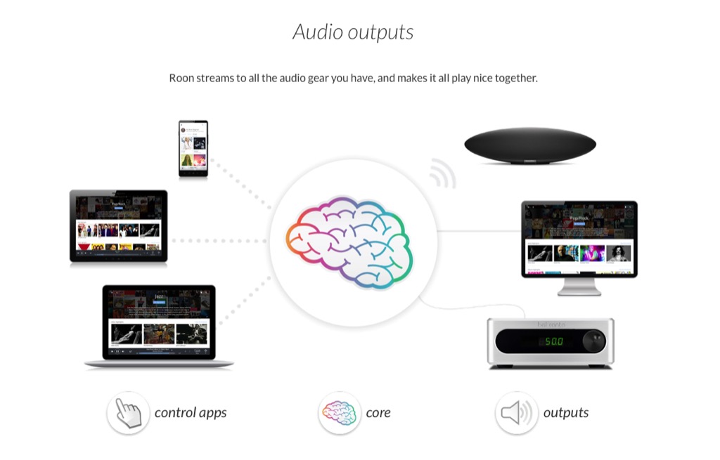 这里先来看下Roon的概况,Roon是美国Roon Labs研发的一套系统。具有音乐播放、文件管理、资料数据库、多房间组合等功能。 Roon的体系分为核心(core),控制(controls),输出(output)三个部分。核心(core)就是服务器端,用于存放文件和传输。Roon使用起来灵活性很高,比如核心部分,可以选择官方认证的Roon core 器材,比如Roon自家的nucleus或者Silent Angel出的 Z1,也可以使用PC 、MAC、 NAS来充当核心。 Roon的控制端涵盖MAC 、PC和手机平板APP,可以用来操作播放、管理和设置。而输出指的就是解码器,目前市面上的很多品牌(如日系品牌 天龙 马兰士)的产品都可以支持,不同品牌之间也可以通过Roon进行整合。