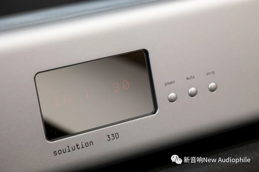 Soulution 330简洁的面板设计,正面有一个显示屏,3个控制按钮和一个音量旋钮,输入信号源的切换按下圆形音量旋钮两秒钟后屏幕右下角显示三个红点的时候就可以通过音量旋钮选择切换输入讯号源。同开机时预设输入源、预设音量、最大音量限制,还可设置为Mono单声道输出,可使用2台soulution 330各别推动喇叭的中高音单元和低音单元。菜单小按钮加音量旋钮还可以调整左右声道的输入电平平衡,有利于环境不对称的用户使用,还配备有影院模式