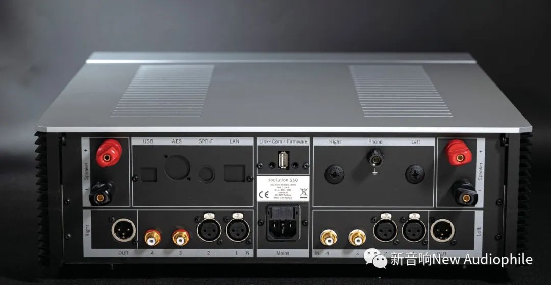 Soulution 330合并机背后预留了两个可安装模组的位置供用户选购升级,左边DAC预留位置提供了USB、AES、SPDIF、LAN等数码输入,右边是唱头放大器预留位置,用户可选购唱头放大器,选购数码\模拟模组后,一台纯音频放大合并机即可变成多功能放大器,一机就支持数码\模拟多种讯号源。Soulution 330一共有4组输入,2组为XLR平衡,2组为单端RCA。Soulution 330设有一组前级输出,可当前级使用,并且可以通过前面板功能按键功能的设置,关闭前级线路,作为一台纯后级使用