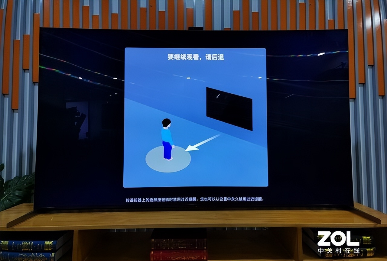 值得一提的是,通过摄像头识别用户所处位置的能力,加入了“过近提醒”功能。可以通过菜单中的“设置距离”功能,根据用户实际的环境,测量并设定触发的位置。我们设置默认距离1米,当使用者与电视屏幕距离为一米以内时,便会出现窗口提示并且画面变黑,想要继续观看必须退回到触发距离之外。这项功能对于家中有孩子的用户非常友好,可以有效监督孩子过近观看,从而一定程度上保护了孩子视力。