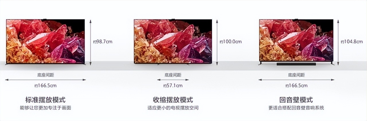 更为人性化的是,索尼75X95EK提供三种底座摆放方式,标准摆放模式将底座放置于最外侧,可以降低对对视觉的干扰;回音壁模式可以将支架提高,以便于搭配回音壁及音响;此外还可以将两支底座调整至屏幕中部的窄位。